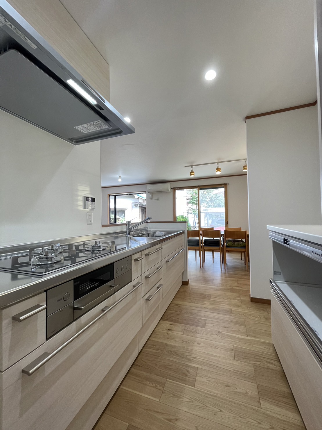 キッチンもペニンシュラを置き対面しました。背面収納を大きなものにしてすべてその中に。
