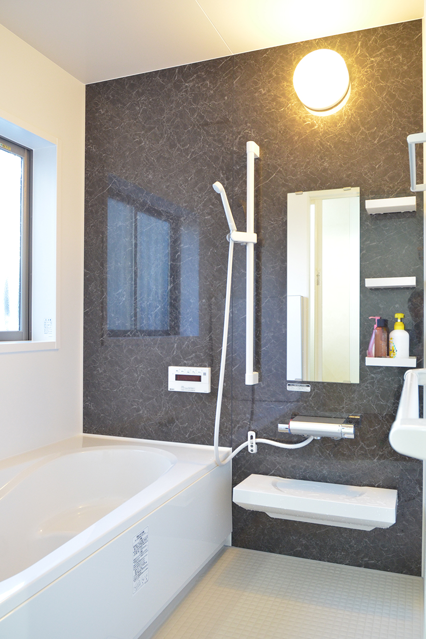 ご主人のご希望が浴室は「ホテル風」にしたいとのことでした。シックで落ち着いた柄、浴槽はブラックを選択。