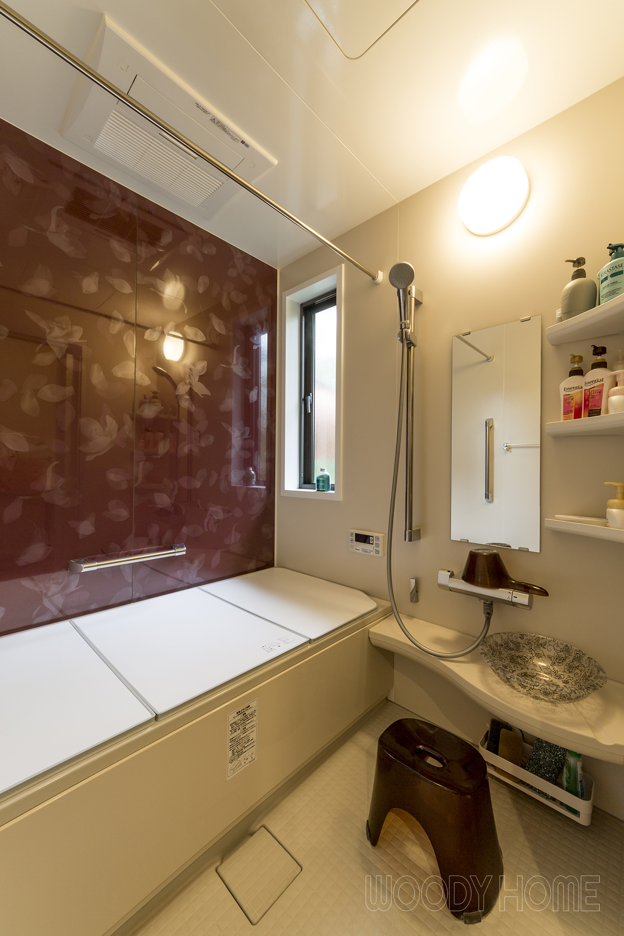 また、窓を活かすためにシャワーフックを窓を跨いで付け、蓋は浴槽に入ってくつろいだ際に頭がぶつからない位置に置ける様に配慮して収めました。