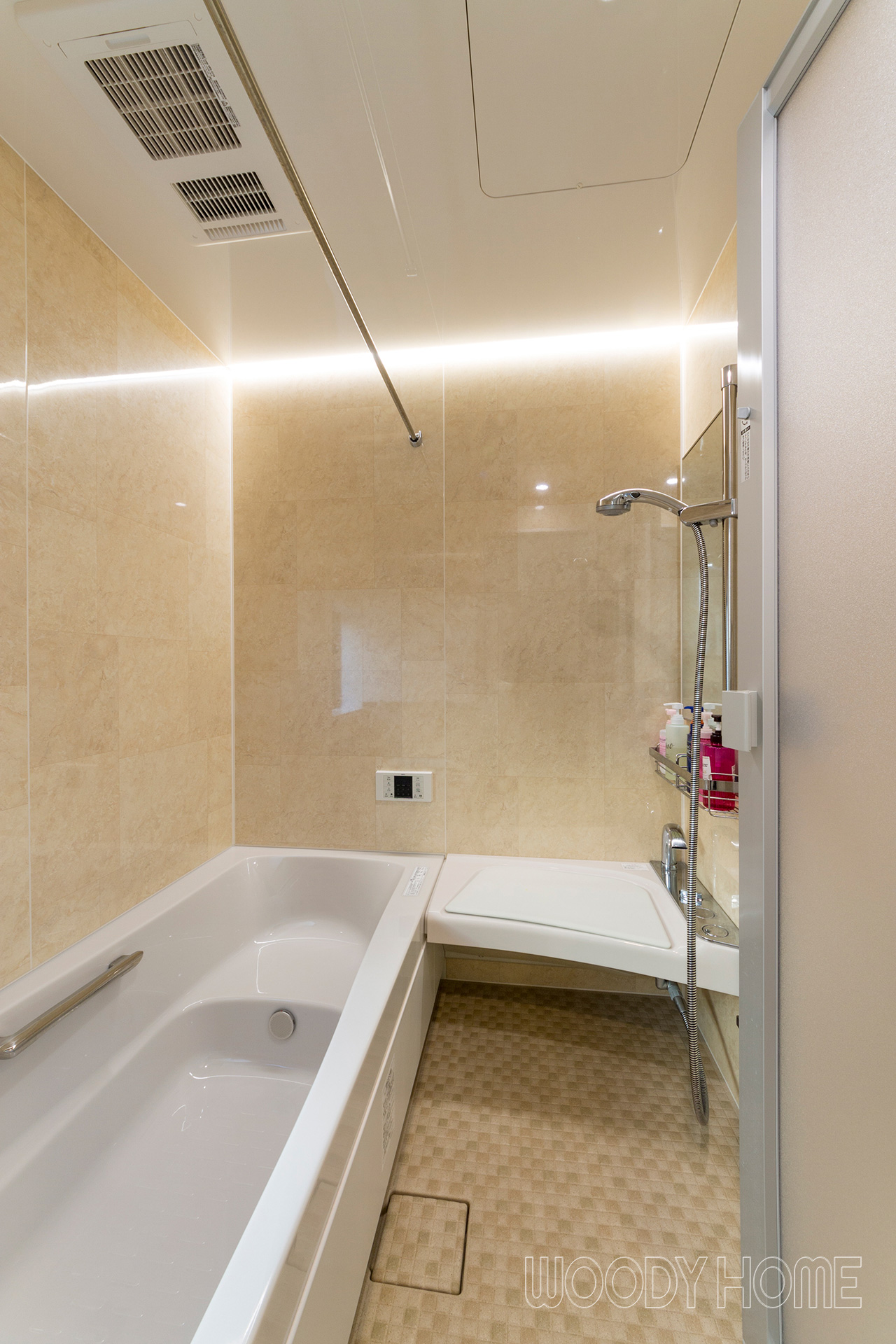 ユニットバスはタカラのキープクリーン浴槽「レラージュ」。浴室をまるごと保温材で包んだバスルームに浴室暖房乾燥機を取り付けた暖かな浴室です。