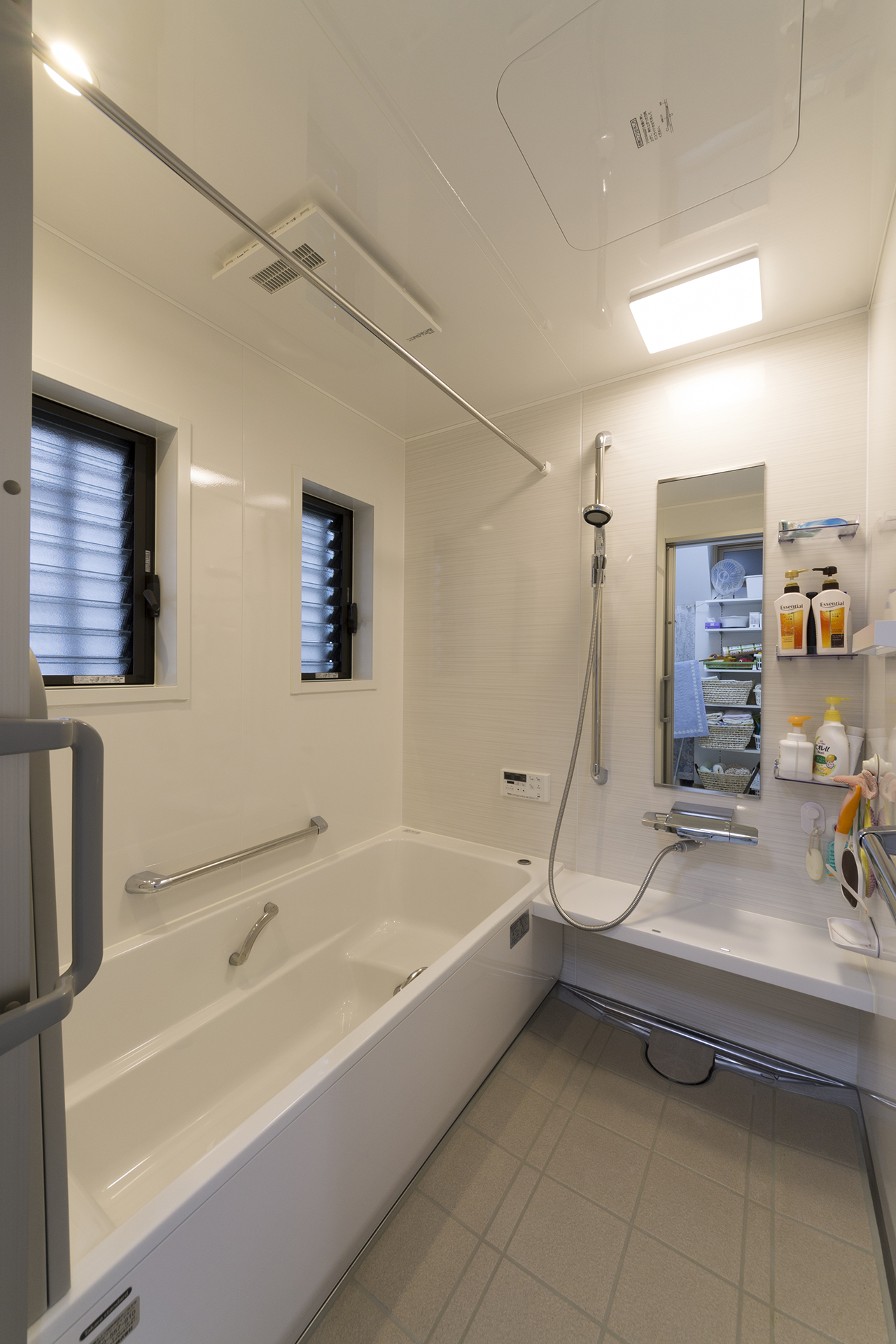 浴室はLIXILのユニットバス"アライズ"。手摺をつけ、蓋も介助しやすい仕様です。