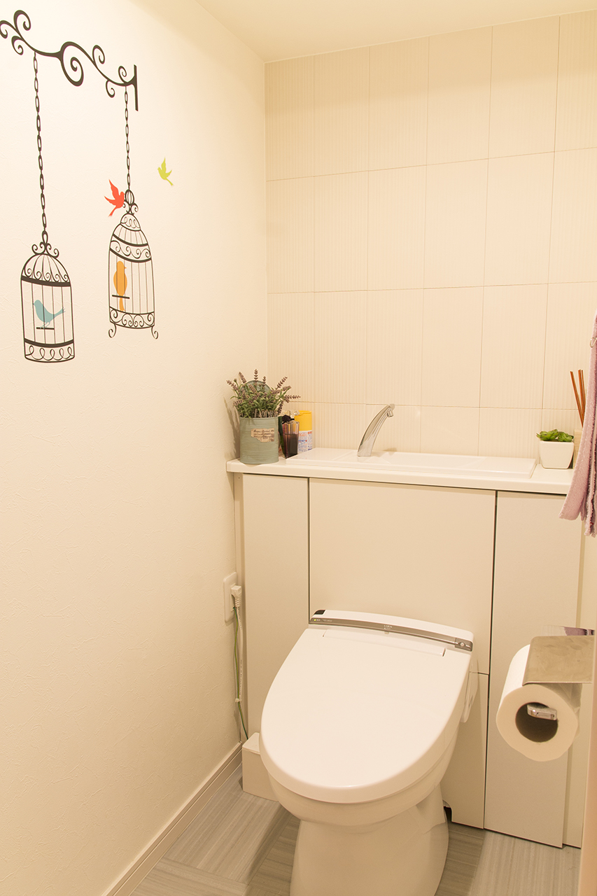 サイドには奥様が貼った小鳥がトイレを楽しませてくれます。