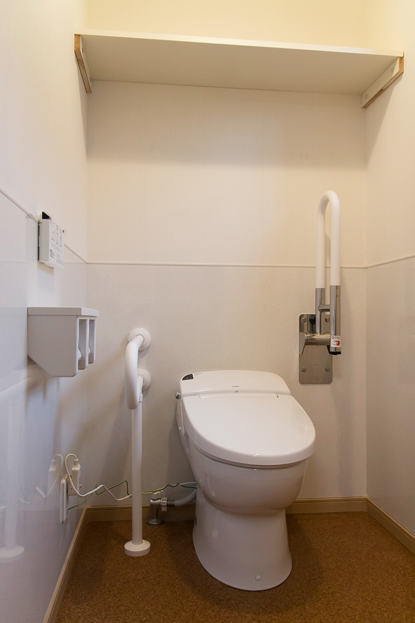 間取変更でスペースを取り、車いすと便座への移動を可能にする導線・設備を設けます。引き込みのスペースや段差の問題から、扉を採用せずにアコーディオンカーテンで仕切ります。