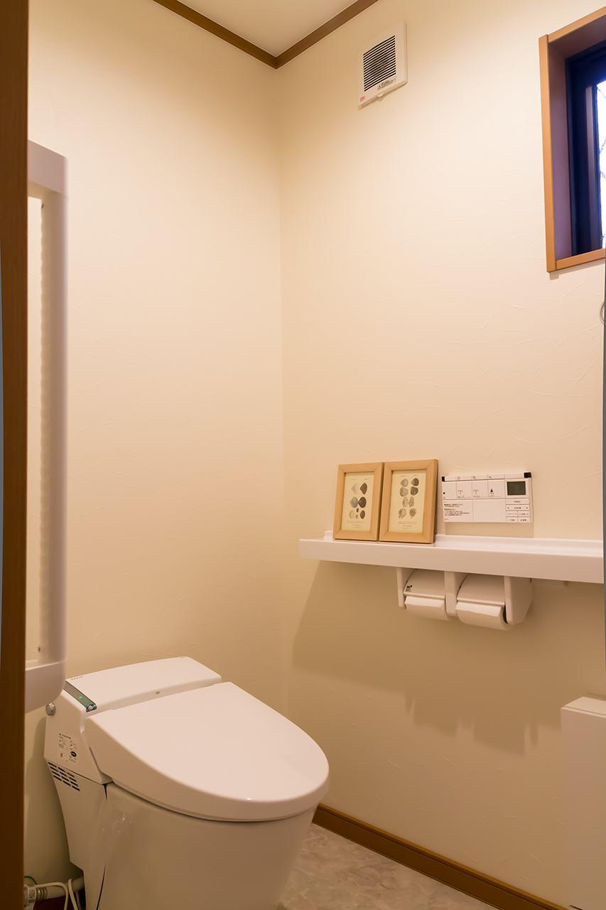 断熱で暖かく、立ち座りの楽なように手摺を配置。奥様が一番気に入っているトイレです。