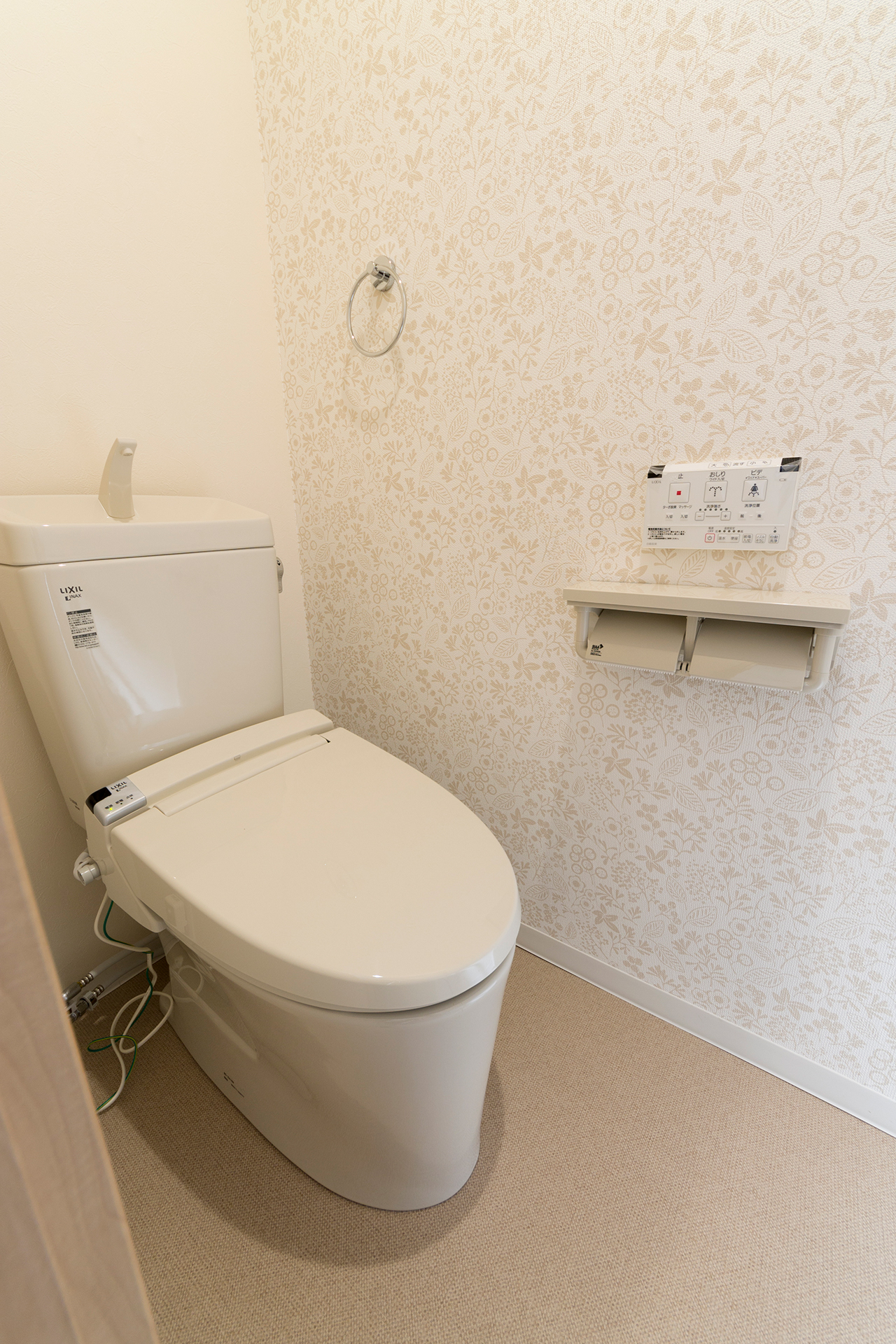 新しくなったトイレルームは収納がアップ、加齢を配慮して手すりを取り付けました。