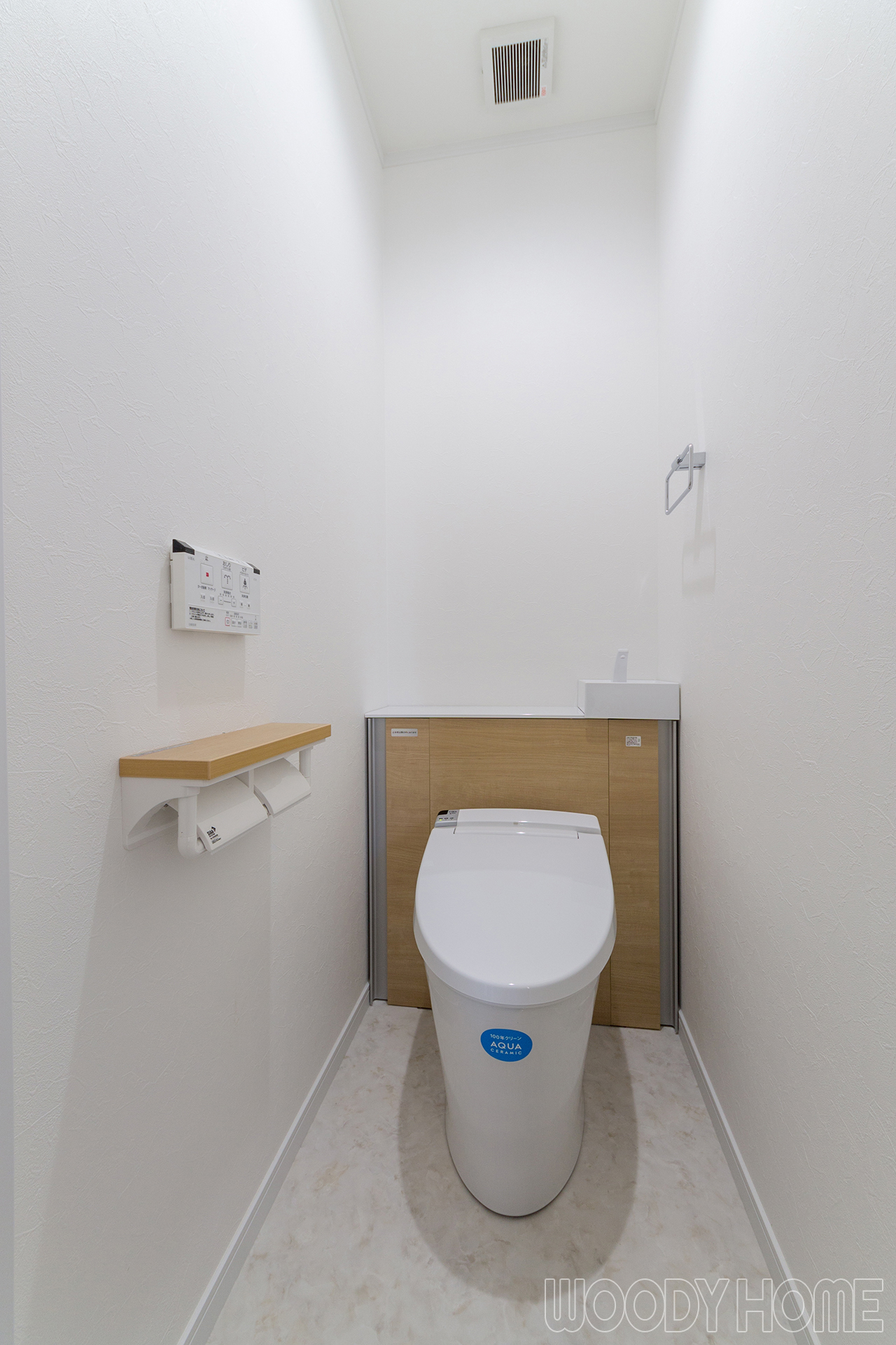 広めの空間を生かして手洗いカウンターを設けました。 床は木目を生かしたナチュラルな雰囲気とし、正面にブルーグレーの壁紙でアクセントを付けました。